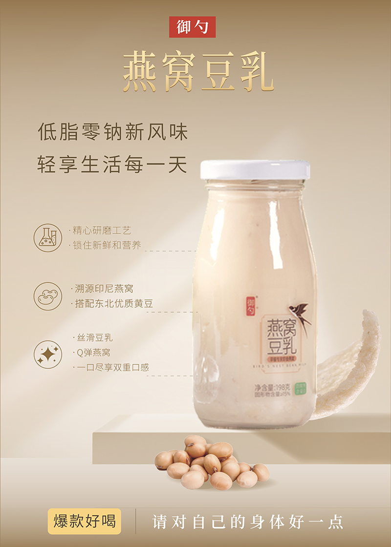 御勺燕窩豆乳創(chuàng)新性地將大豆與燕窩相結(jié)合,每瓶含水發(fā)燕窩200mg,真材實料,滿滿都是誠意。它選用東北黑土地自然生長的一級非轉(zhuǎn)基因大豆,搭配印尼進口優(yōu)質(zhì)燕窩,從源頭保障品質(zhì)。制作過程中運用破壁研磨技術(shù),使得口感細(xì)膩醇厚,同時最大程度保留養(yǎng)分不流失 。經(jīng)過高溫滅菌與無菌罐裝,產(chǎn)品配料干凈,0添加、無防腐,讓消費者喝得放心。